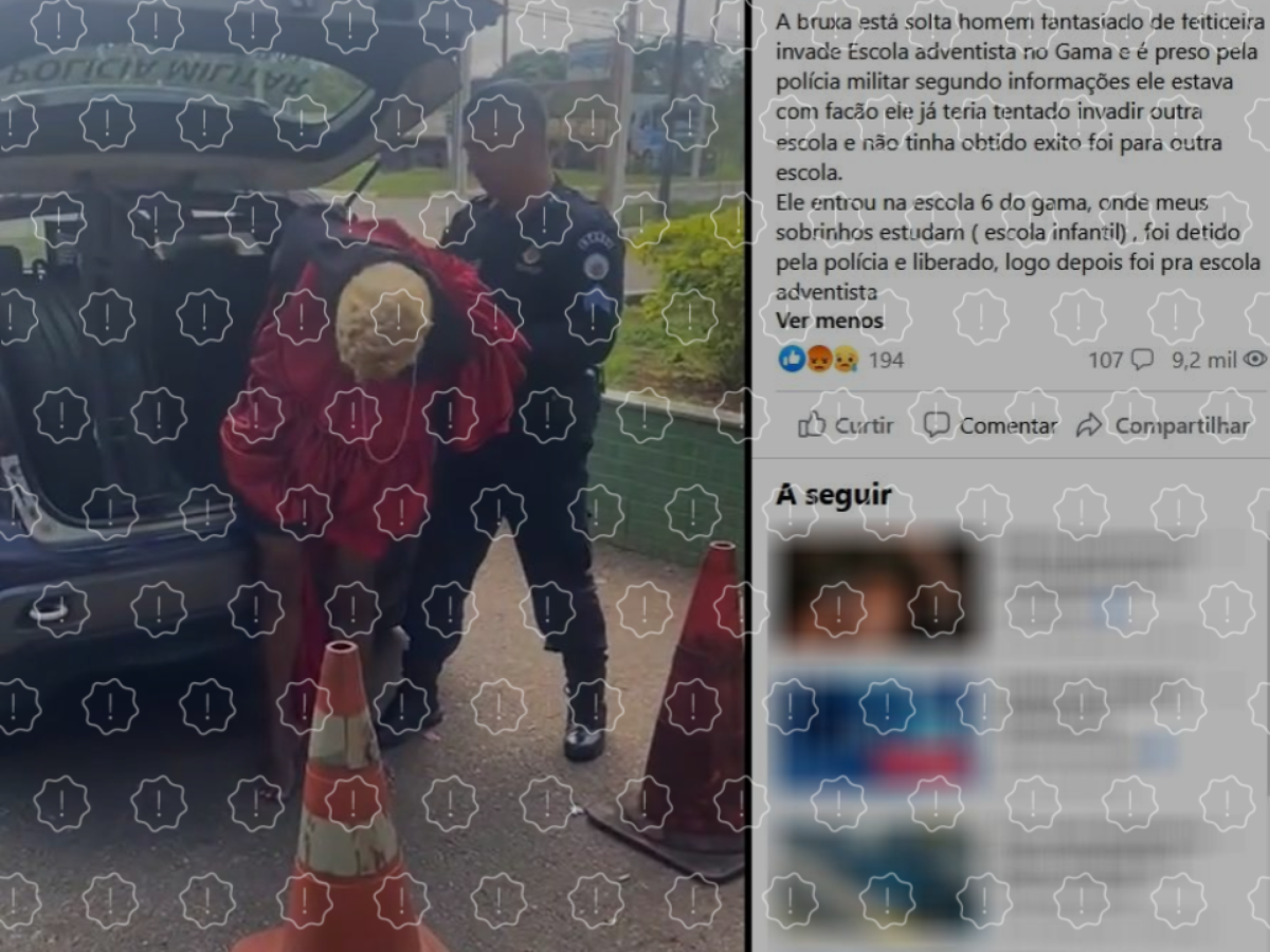 Homem fantasiado de feiticeira invade escola adventista no Gama e é preso pela polícia militar. Segundo informações, ele estava com facão e teria tentado invadir outra escola