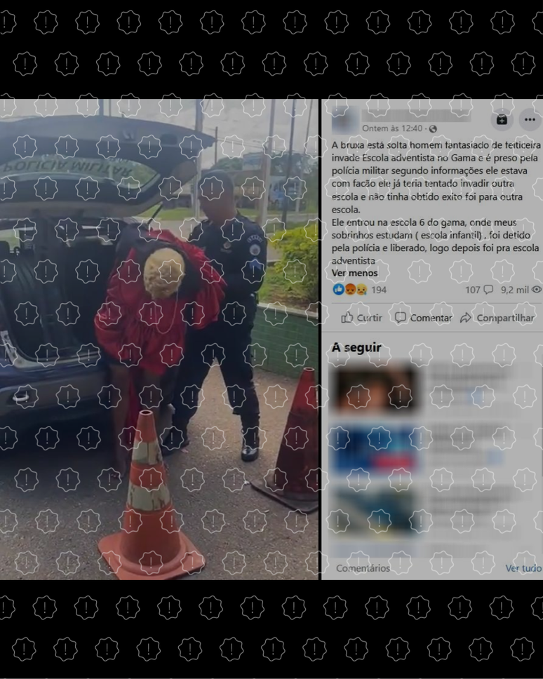 Posts nas redes enganam ao afirmar que um homem fantasiado invadiu o Colégio Adventista do Gama, no Distrito Federal, na manhã de terça (18) para cometer um atentado. Segundo o colégio e a SSP, não houve qualquer tentativa de entrada na escola. O homem foi preso por ameaçar o pai de um dos estudantes na porta do colégio; algumas horas antes, ele teria tentado intimidar um aluno de outra instituição de ensino próxima. Não houve agressão e ninguém ficou ferido.