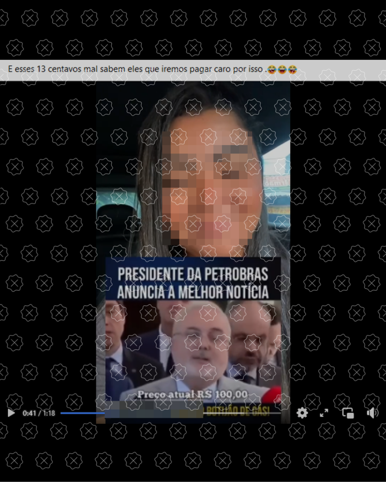 Minutos depois, na mesma entrevista, o presidente avalia que a redução no preço do gás de cozinha seria a melhor notícia: "Botijão de gás, que é a melhor notícia, baixamos de R$ 100. Baixamos de R$ 100. Então pela primeira vez desde outubro de 2020 nós teremos um botijão de gás com preço médio esperado no mercado a R$ 99,97. R$ 0,13 abaixo dos R$ 100. Esse é o efeito dos dos anúncios de hoje". As peças de desinformação usam apenas esse trecho para sugerir que a queda teria sido ínfima.