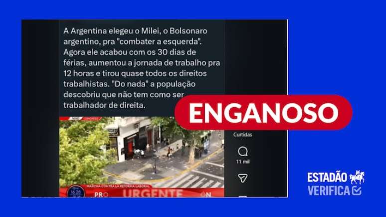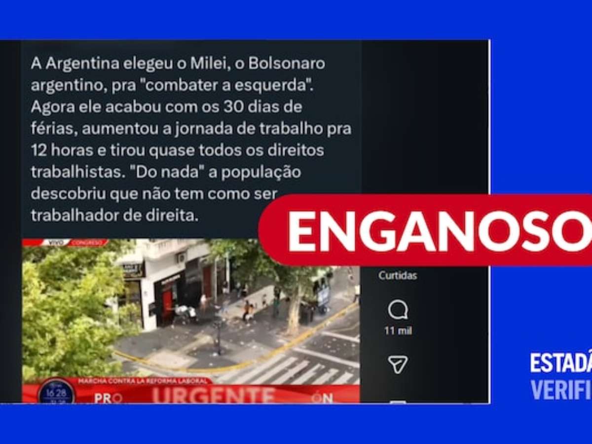 O que estão compartilhando: que o presidente da Argentina, Javier Milei, teria acabado com os 30 dias de férias, aumentado a jornada de trabalho para 12 horas e tirado quase todos os direitos trabalhistas.