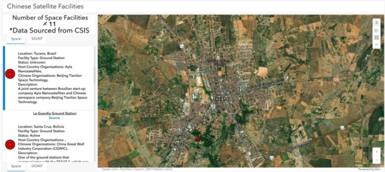 Segundo o texto, a China teria acesso a 11 instalações espaciais na América Latina - no Brasil, Argentina, Bolívia, Chile e Venezuela - que garantiriam ao país asiático o acesso a dados de alta precisão por imagens de satélite.