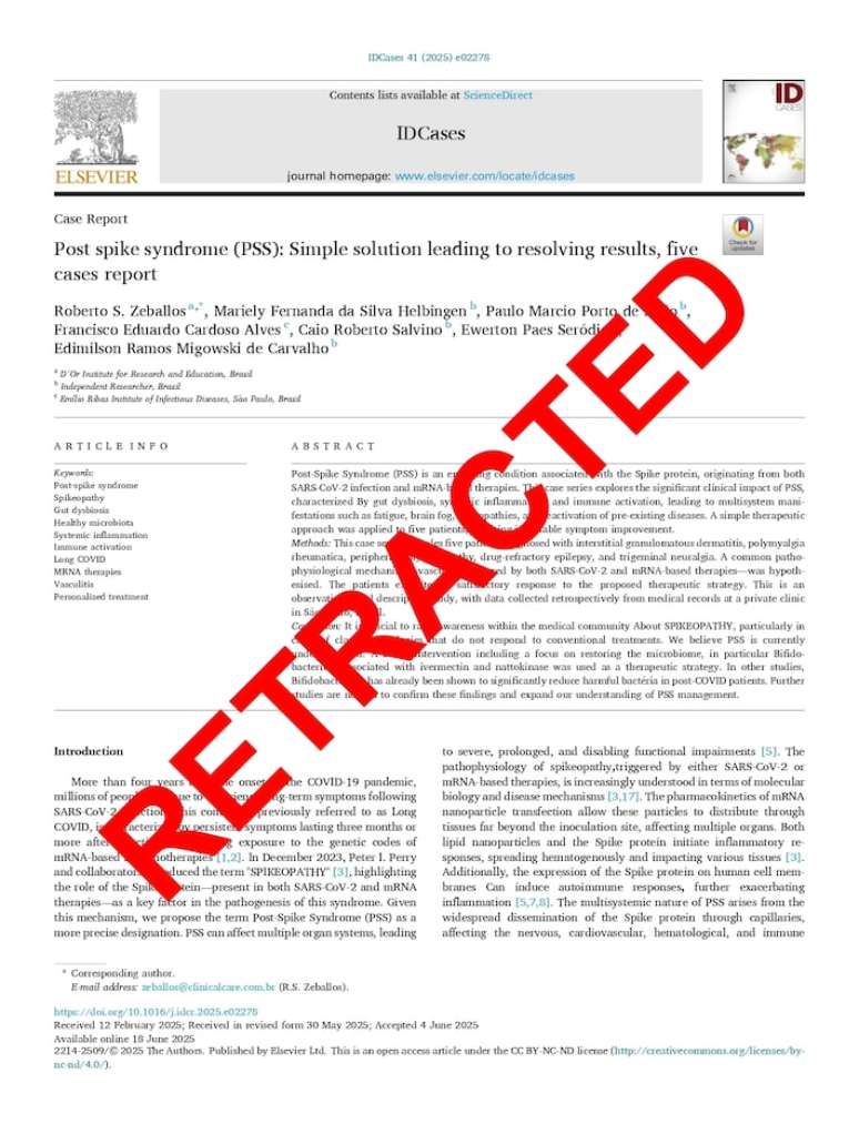 A existência da "spikeopatia", porém, não é comprovada pela comunidade científica. O estudo publicado pelos médicos foi retirado de publicação pela editora Elsevier devido ao risco da disseminação de protocolos de tratamento não validados e por não haver comprovação de relação entre a suposta doença e vacinas.