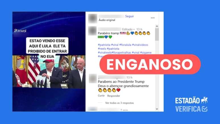 Saiba mais: publicado no Instagram, o vídeo verificado tem 17 segundos e está em inglês. A gravação mostra o momento em que Trump exibe uma foto impressa enquanto comenta sobre ela. Embora o rosto de Putin não apareça com nitidez na imagem, Trump menciona o nome do russo durante sua fala. Acima do vídeo, uma legenda em português afirma que ele teria dito: "Estão vendo, esse aqui é Lula, ele está proibido de entrar nos EUA". No entanto, a declaração do republicano não foi traduzida fielmente.