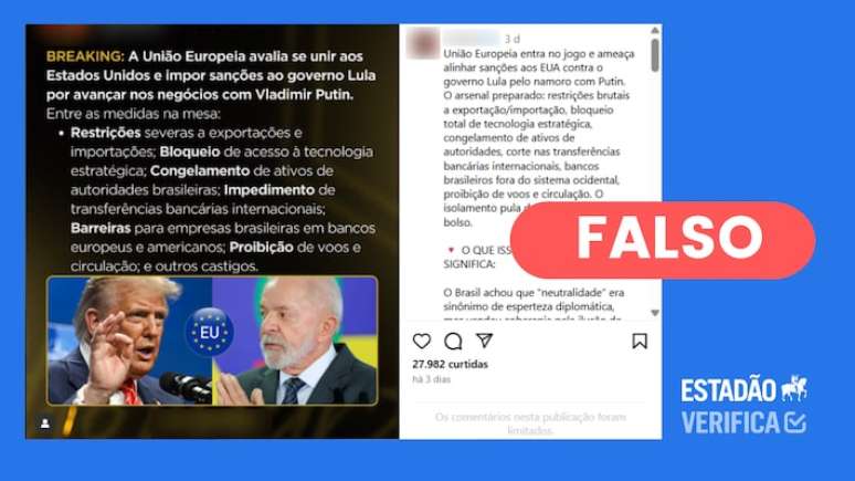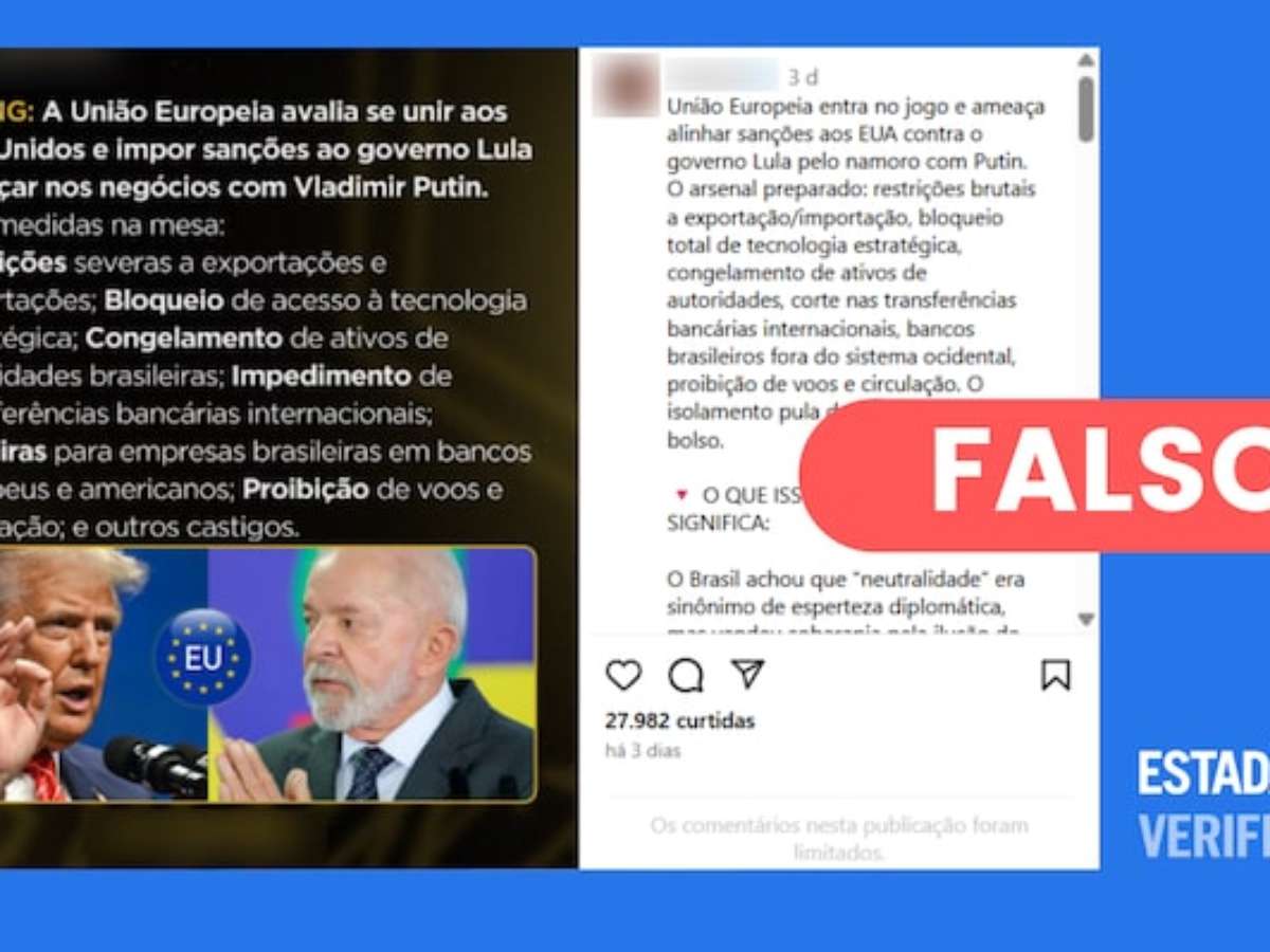 O Estadão Verifica investigou e concluiu que: é falso. Não houve anúncio de sanções contra o Brasil por parte do bloco europeu. Nos últimos dias, segundo a imprensa internacional, a União Europeia tem se movimentado para retaliar os Estados Unidos diante das tarifas impostas por Trump ao bloco. Os europeus também anunciaram um 18º pacote de sanções à Rússia.