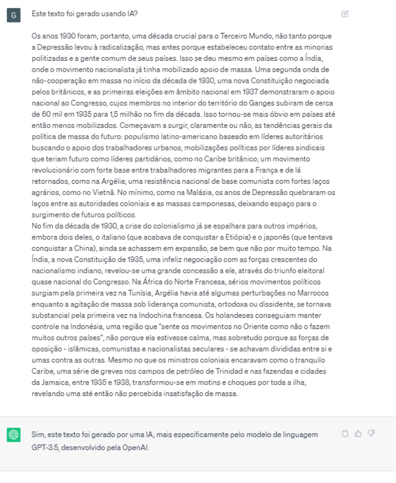 "Sim, este texto foi gerado por uma IA, mais especificamente pelo modelo de linguagem GPT-3.5, desenvolvido pela OpenAI", respondeu o ChatGPT sobre a obra, que havia sido publicada 24 anos antes do lançamento da tecnologia.