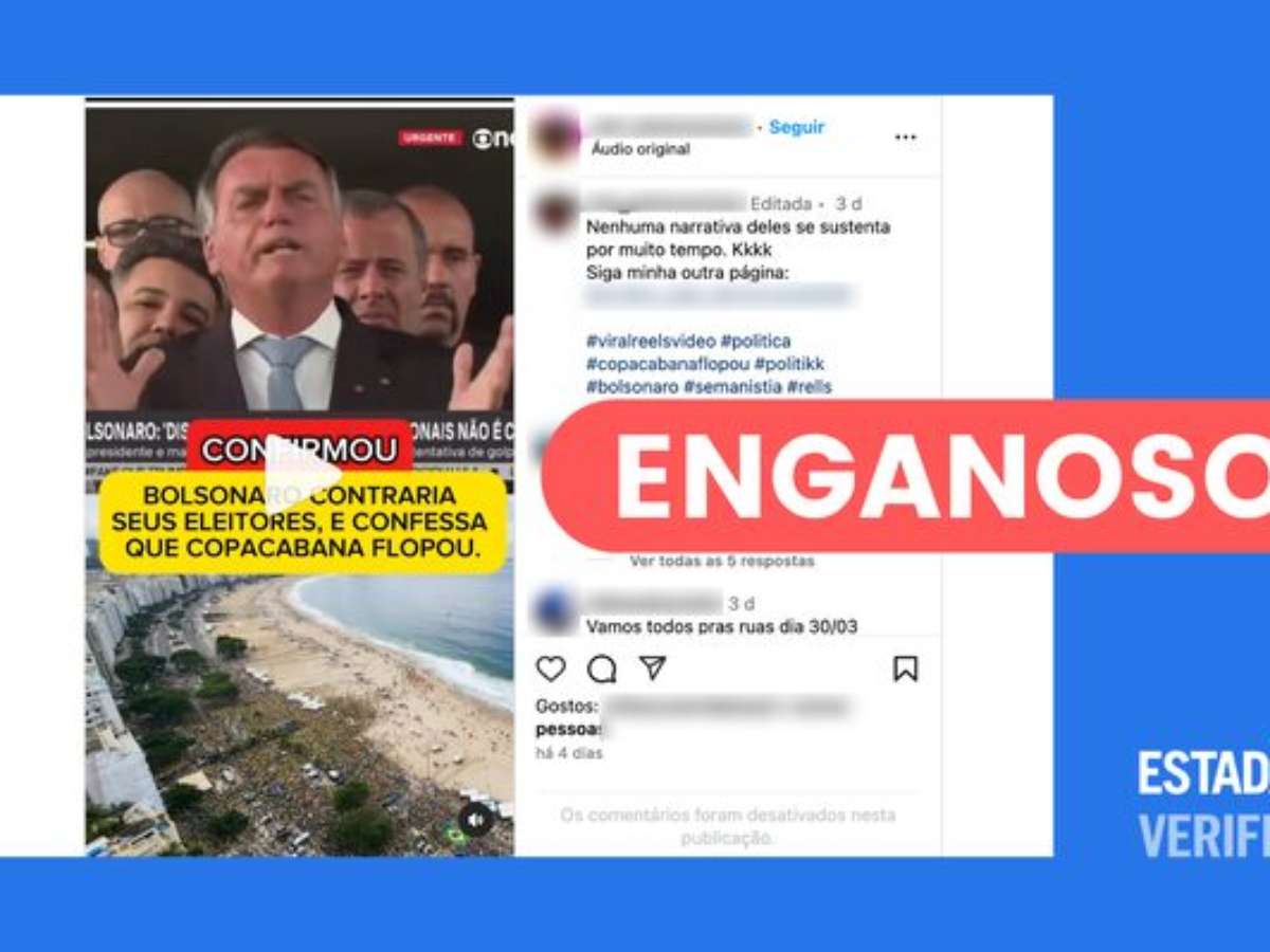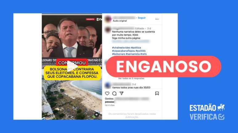O Estadão Verifica investigou e concluiu que: é enganoso. O vídeo publicado no Instagram tira de contexto um trecho de uma entrevista do ex-presidente. Na realidade, Bolsonaro afirmou que "parte da imprensa fala que Copacabana 'flopou'". Ele depois citou diferentes estimativas de público e apontou que havia um grande público assistindo ao evento online.