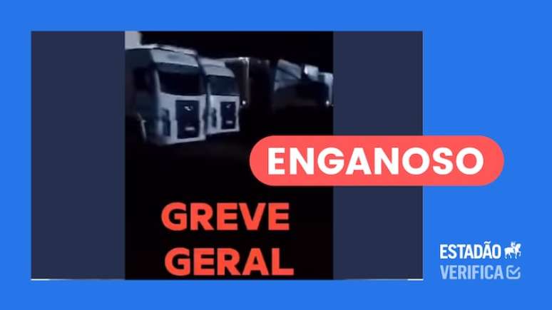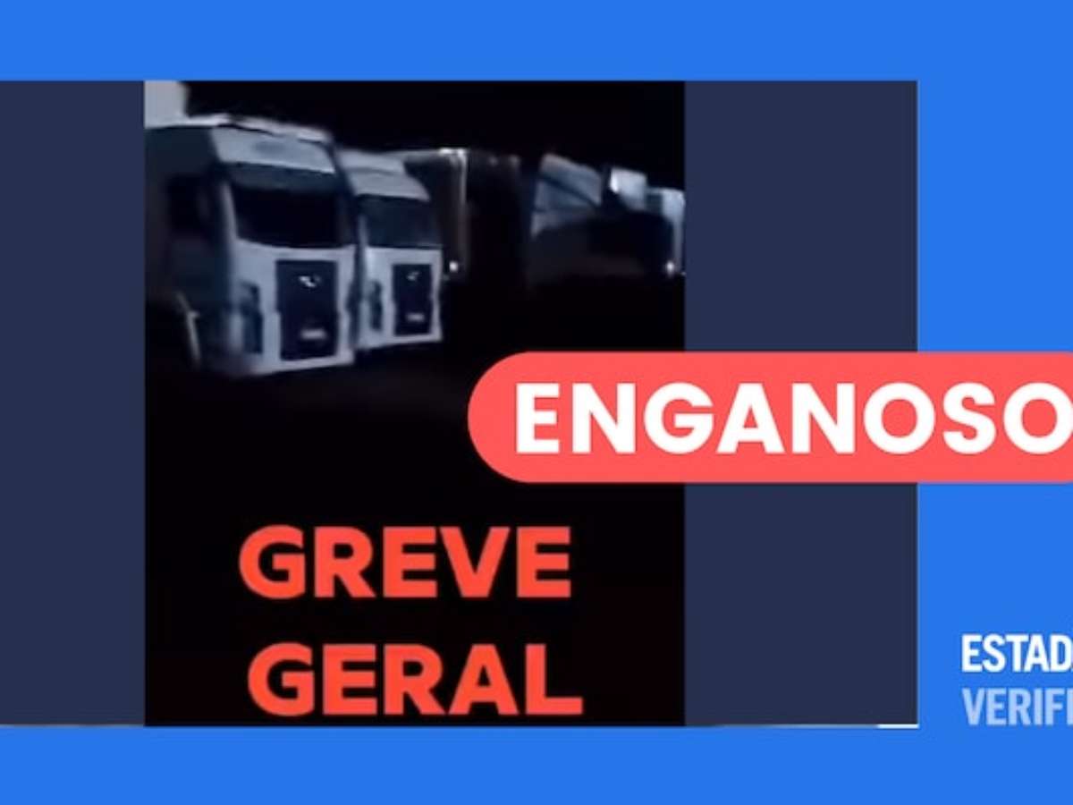 Saiba mais: o vídeo mostra caminhões parados em uma cena noturna. Na tela, está escrito "greve geral" em letras vermelhas. Já na abertura da gravação constam os dizeres: "Acontecendo agora. Brasil parando". O homem que grava o vídeo diz: "Galera, em apoio a Bolsonaro. (...) Todo mundo parado, tudo em apoio, ninguém vai rodar".