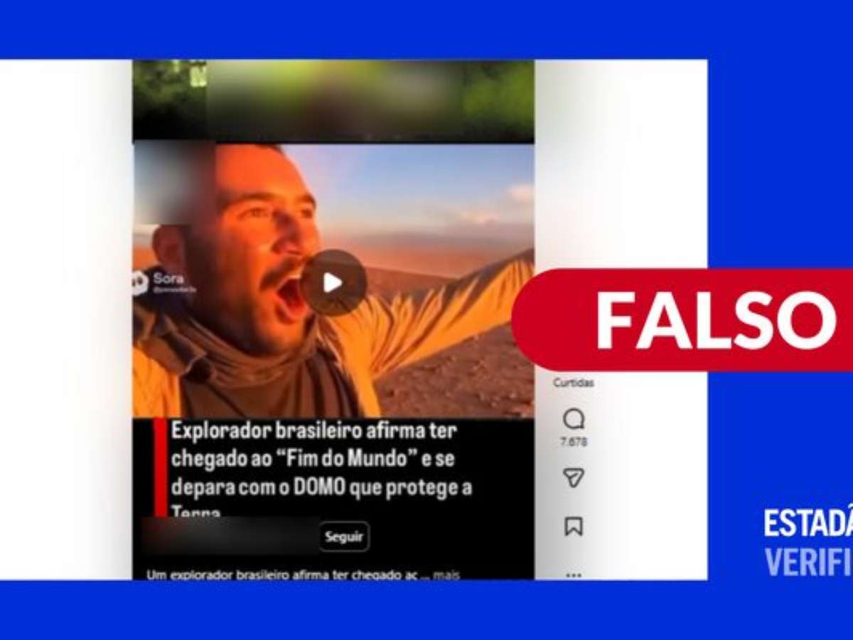 O que estão compartilhando: vídeo mostraria um explorador brasileiro chegando ao "fim do mundo". Ele encontra um domo que protegeria o planeta e grita: "A Terra é plana!"