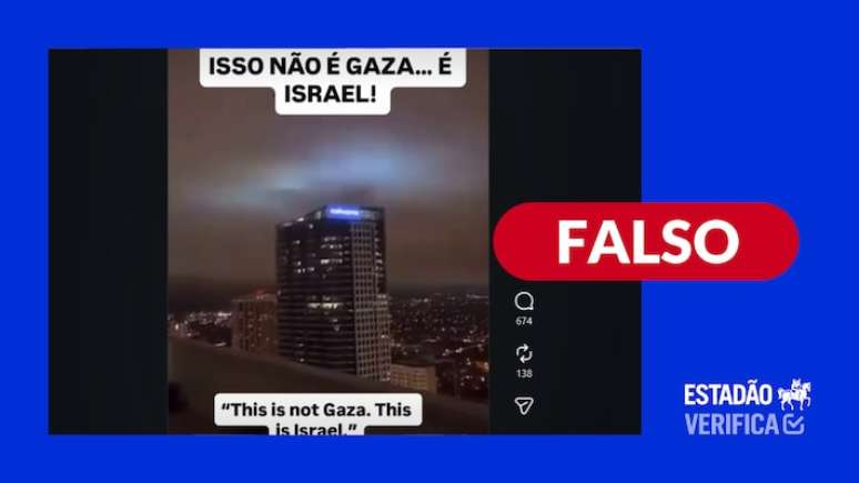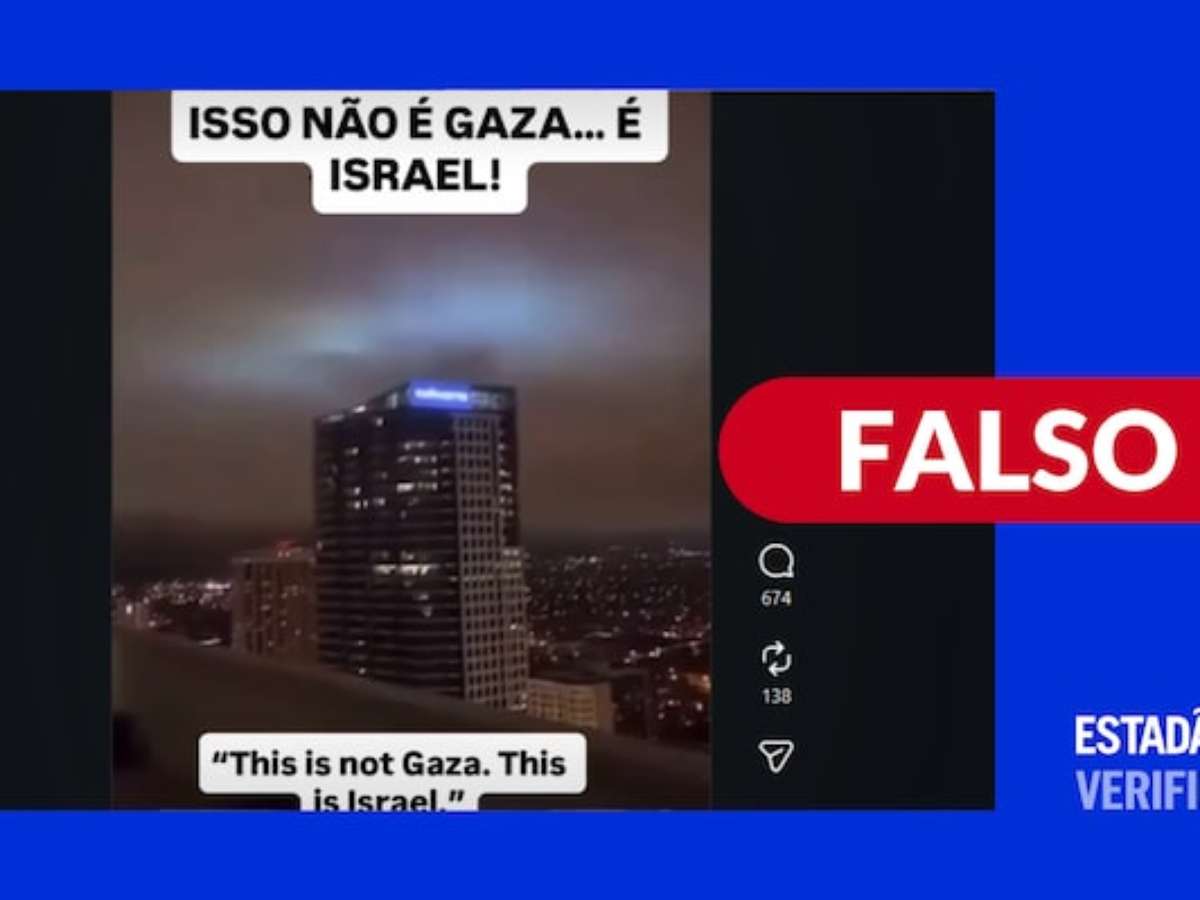 Saiba mais: circula nas redes sociais um vídeo que aparenta mostrar um prédio com um letreiro azul brilhante no topo sendo bombardeado. A mídia parece ter sido gravada durante a noite e a construção parece "derreter" após a explosão. "Isso não é Gaza... É Israel", afirma o texto sobrescrito ao conteúdo.