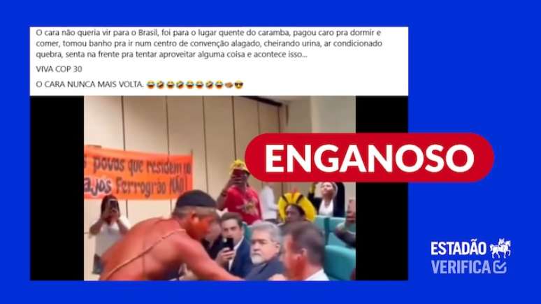 O Estadão Verifica investigou e concluiu que: é enganoso. As imagens não foram registradas durante a COP-30. O episódio ocorreu em maio de 2024 em Santarém (PA), durante o Seminário Técnico que discutia a Ferrogrão, projeto de uma ferrovia ligando Sinop (MT) e o Porto de Miritituba, no município de Itaituba (PA). As imagens viralizaram nas redes sociais e o caso foi noticiado pela imprensa.