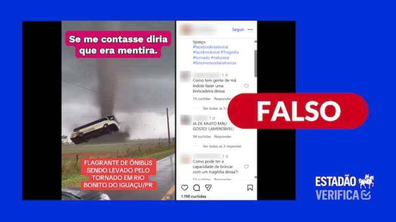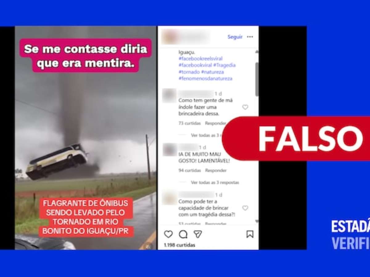 O Estadão Verifica investigou e concluiu que: é falso. As imagens foram geradas com ferramentas de inteligência artificial. Há diversos elementos que confirmam isso. Por exemplo, o ônibus atravessa um poste sem que nada aconteça com ele. Câmeras de segurança captaram o momento real da chegada do tornado a Rio Bonito do Iguaçu; as imagens verdadeiras não condizem com a cena exibida no vídeo viral.