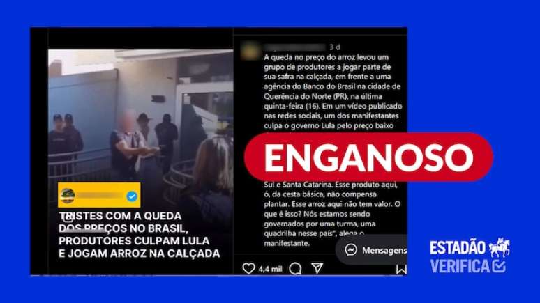 Um deles diz que não compensa mais plantar o grão e que o País está sendo governado por uma quadrilha. À gravação foi adicionada a seguinte legenda: "Tristes com a queda dos preços no Brasil, produtores culpam Lula e jogam arroz na calçada".
