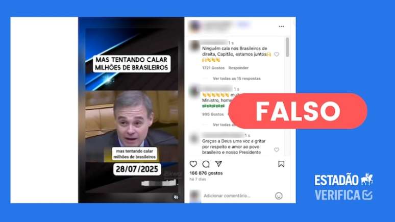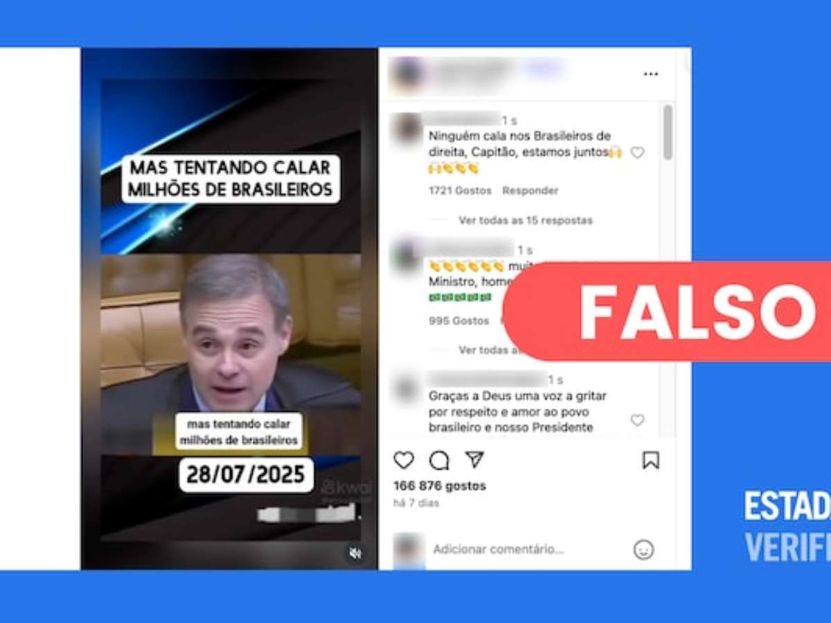O que estão compartilhando: um vídeo que mostra o ministro do Supremo Tribunal Federal (STF) André Mendonça afirmando que o tribunal tem feito "perseguição descarada" contra Jair Bolsonaro (PL). Mendonça aparece dizendo, ainda, que "não estão julgando apenas um homem, mas tentando calar milhões de brasileiros". Sobre as imagens há uma legenda com a data 28/07/2025.