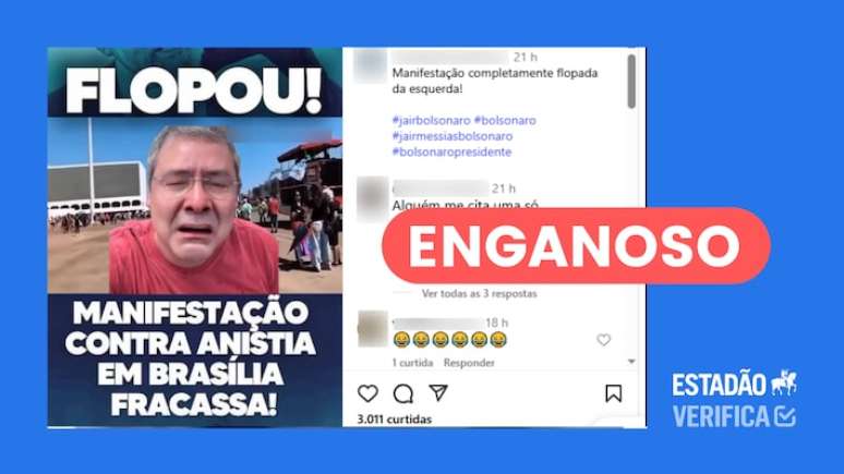 Em algumas das postagens, o vídeo tem áudio de risos. Alguns dos posts colocam a palavra "flopou" e frases como "Manifestação contra anistia em Brasília fracassa!" e "Esquerda faz fiasco em manifestação em Brasília". Mas essas postagens são enganosas.