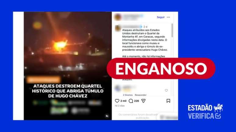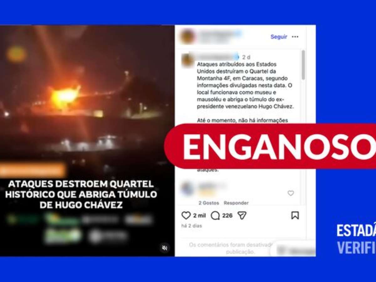O Estadão Verifica investigou e concluiu que: é enganoso. O vídeo não mostra o Quartel da Montanha 4F, onde o ex-presidente da Venezuela está sepultado. Na verdade, é o prédio que abriga o Comando General da Milícia Bolivariana, o antigo Observatório Gagigal. Vídeos publicados pela Fundação Hugo Chávez na noite de sábado, 3, e no domingo, 4, após a captura de Nicolás Maduro, mostram o Quartel 4F intacto. Jornalistas da agência EFE estiveram no prédio e confirmaram que o complexo não sofreu danos visíveis.