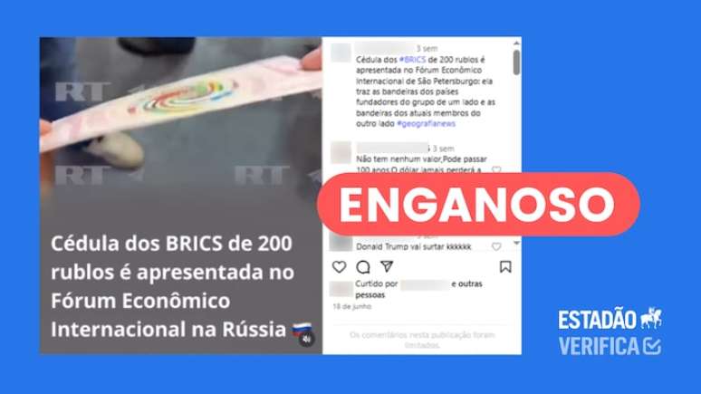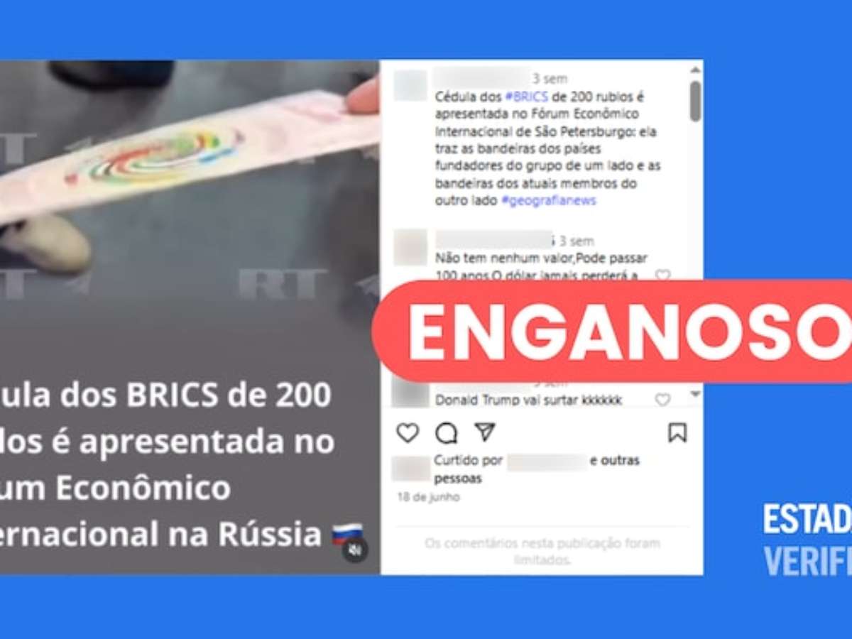 Saiba mais: A imagem da cédula com bandeiras de diversos países é verdadeira, mas não é oficial. Trata-se de uma cédula simbólica, apresentada no evento de economia que ocorreu no último mês em São Petersburgo. A agência de notícias russa Sputnik divulgou no X o vídeo que deu origem ao boato. A legenda da publicação original deixa claro que a cédula é simbólica: