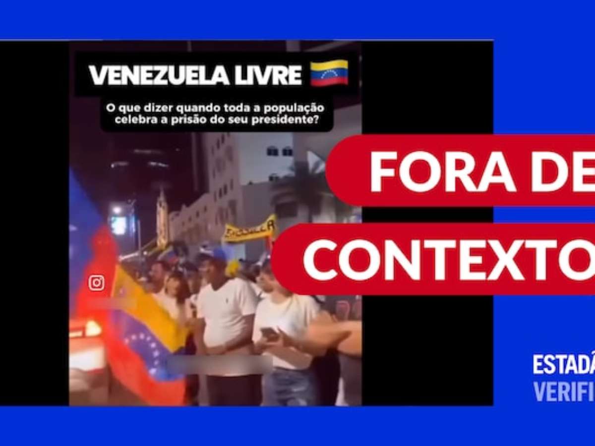 O que estão compartilhando: vídeo mostra manifestação de pessoas nas ruas com bandeiras da Venezuela e balões nas cores do país. Na tela do vídeo, foram inseridas as frases: "Venezuela livre" e "O que dizer quando toda a população celebra a prisão de seu presidente?".