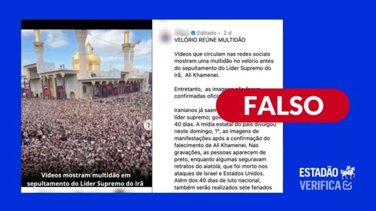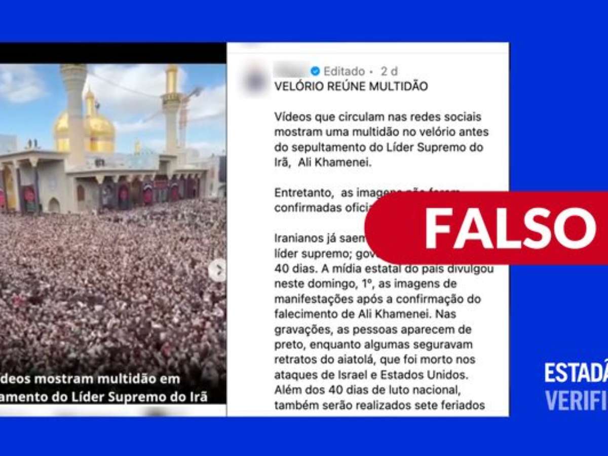 O Estadão Verifica investigou e concluiu que: é falso. A gravação mostra um ritual sagrado no Iraque, sem relação com Khamenei. O local mostrado é a mesquita de Al-Kadhimiya, na capital Bagdá. Peregrinos se reúnem no santuário em homenagem ao Imã Moussa al-Kadhim, sepultado no local. Khamenei foi morto no dia 28 de fevereiro, durante uma ofensiva militar dos Estados Unidos e de Israel. O funeral do aiatolá aconteceria nesta quarta-feira, 4, mas foi adiado, segundo a agência de notícias iraniana Tasnim. Ainda não foi estabelecida uma nova data para o evento.