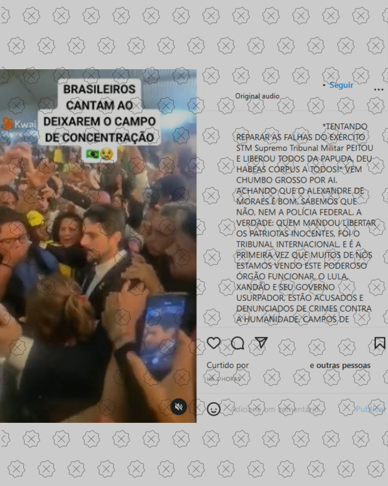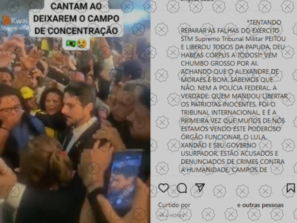 Publicações nas redes enganam ao afirmar que um vídeo que mostra dezenas de pessoas cantando registra o momento em que o STM determinou a soltura dos golpistas responsáveis pela invasão à sede dos Três Poderes no dia 8 de janeiro. A gravação original foi publicada no dia 10 de janeiro deste ano e mostra os detidos pelos atos comemorando a visita do senador Marcos do Val à Academia da Polícia Federal, em Brasília. Naquele dia, cerca de 700 pessoas ainda estavam presas no ginásio da instituição. O STM não tem poder para julgar crimes cometidos por civis.