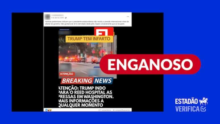 O Estadão Verifica checou e concluiu que: é enganoso. O vídeo mostra um registro de viaturas publicado pelo ativista Charlie Kirk no X, em 2024, após Trump ser alvo de um atentado em comício na Pensilvânia. Não há informações de que o presidente americano tenha sido hospitalizado recentemente. Ele fez várias aparições públicas nos últimos dias, como uma participação em evento de Páscoa da Casa Branca na segunda-feira, 6.