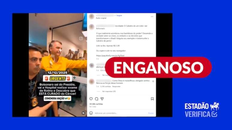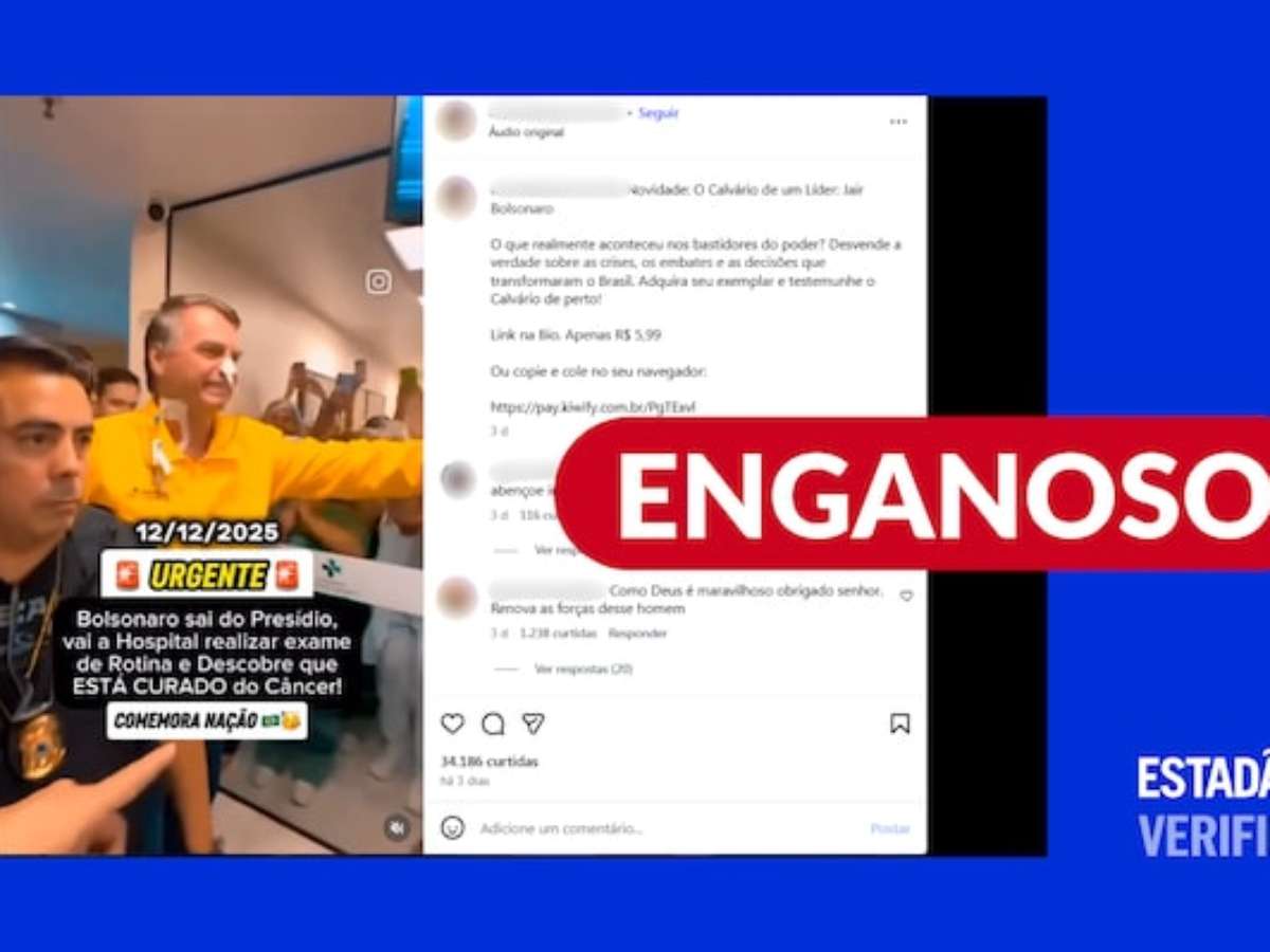 O que estão compartilhando: vídeo mostraria o ex-presidente Jair Bolsonaro (PL), que está preso, deixando hospital após descobrir que está curado de câncer, no dia 12 de dezembro. As imagens mostram ele sendo recepcionado por vários apoiadores.
