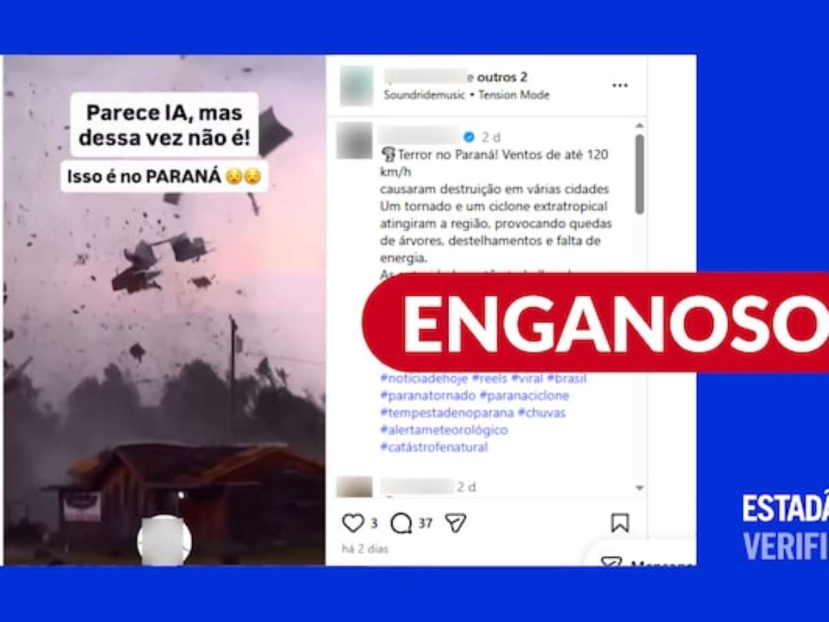 Saiba mais: desde a última sexta-feira, 7, quando três tornados atingiram cidades do Paraná em menos de duas horas com ventos de até 330 km/h, circulam nas redes sociais imagens fora de contexto, manipuladas e geradas por inteligência artificial, que enganam usuários ao afirmar retratar a destruição provocada pelo fenômeno. A postagem verificada é um exemplo de conteúdo que foi retirado de contexto.