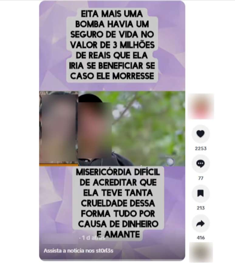 Outra publicação na rede social, com 16 mil curtidas e mais de 5 mil compartilhamentos, informa que a mãe das crianças seria uma "viúva negra" que matou os filhos e o marido para esconder o segredo de uma traição conjugal. Essa postagem usa imagens de uma reportagem sobre um outro crime, transmitida em um programa policial.