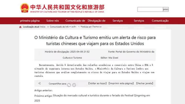 O primeiro aviso, publicado no site oficial do Ministério da Cultura e Turismo, recomenda que turistas chineses considerem os riscos antes de embarcar para os EUA. A justificativa apresentada é o aumento das tensões entre os dois países. O texto afirma: "Recentemente, devido à deterioração das relações econômicas e comerciais entre China e EUA e à situação da segurança interna nos Estados Unidos, o Ministério da Cultura e Turismo alerta os turistas chineses para que avaliem cuidadosamente os riscos de viajar para os Estados Unidos e tomem cuidado."