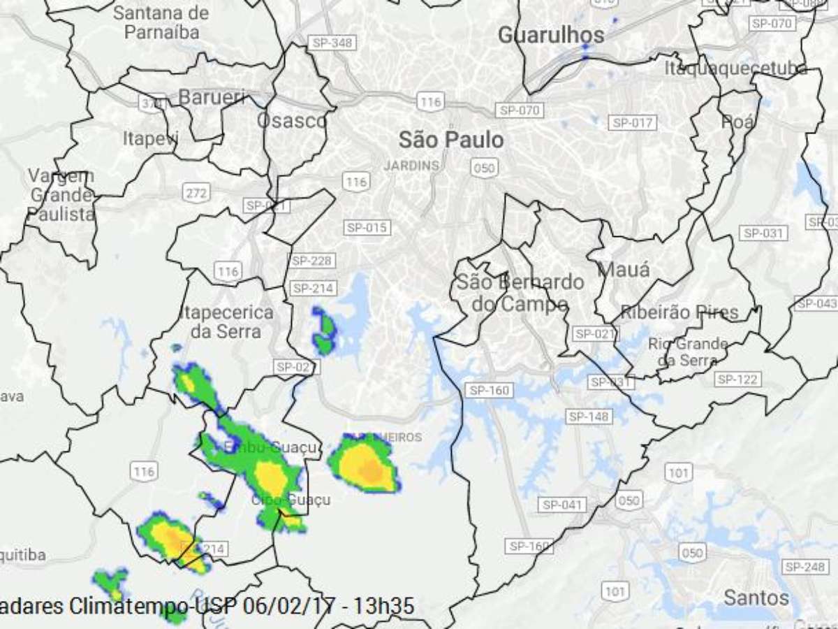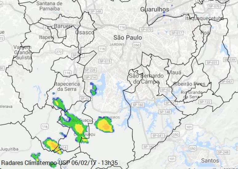 Às 13h35, os radares Climatempo-USP já detectavam chuva moderada a forte na zona sul da capital, em áreas de Embu-Guaçu, de Juquitiba e de Itapecerica da Serra.