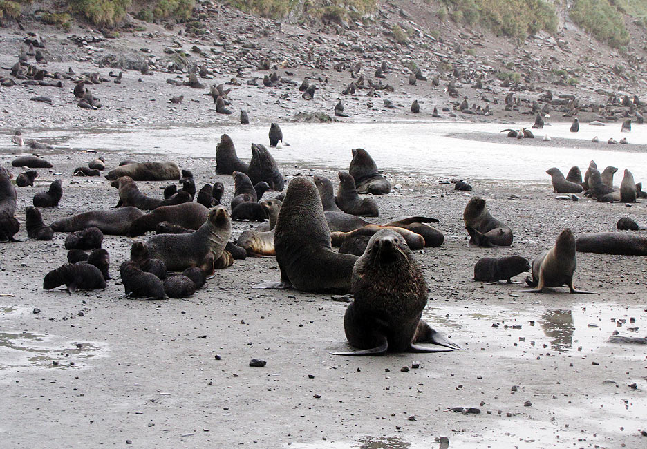 Right Whale Bay, no noroeste das Ilhas Geórgias do Sul, não é um lugar comum. A praia é um local inóspito e escuro – desolador é um bom adjetivo para o lugar. Ninguém pode, entretanto, acusar o lugar de ser desprovido de vida. Além de uma pequena colônia de pinguins, o local abriga uma das maiores colônias de acasalamento de lobos-marinhos antárticos, uma das nove espécies de lobos-marinhos do planeta.