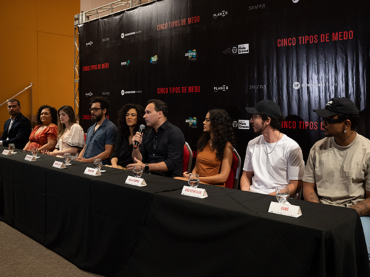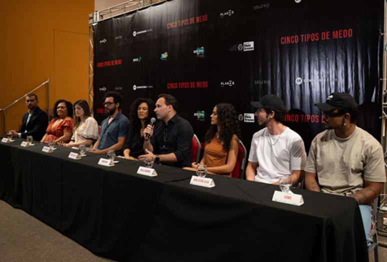 Mesa: Link (esquerda para direita: Jefferson Neves - sec. de estado de Cultura; Eloá Pimenta - atriz; Amanda Ruano - Druzina Content; Rui Ricardo Diaz - ator; Bárbara Colen - atriz; Bruno Bini - diretor; Bella Campos - atriz; João Vítor Silva - ator; Xamã - ator)