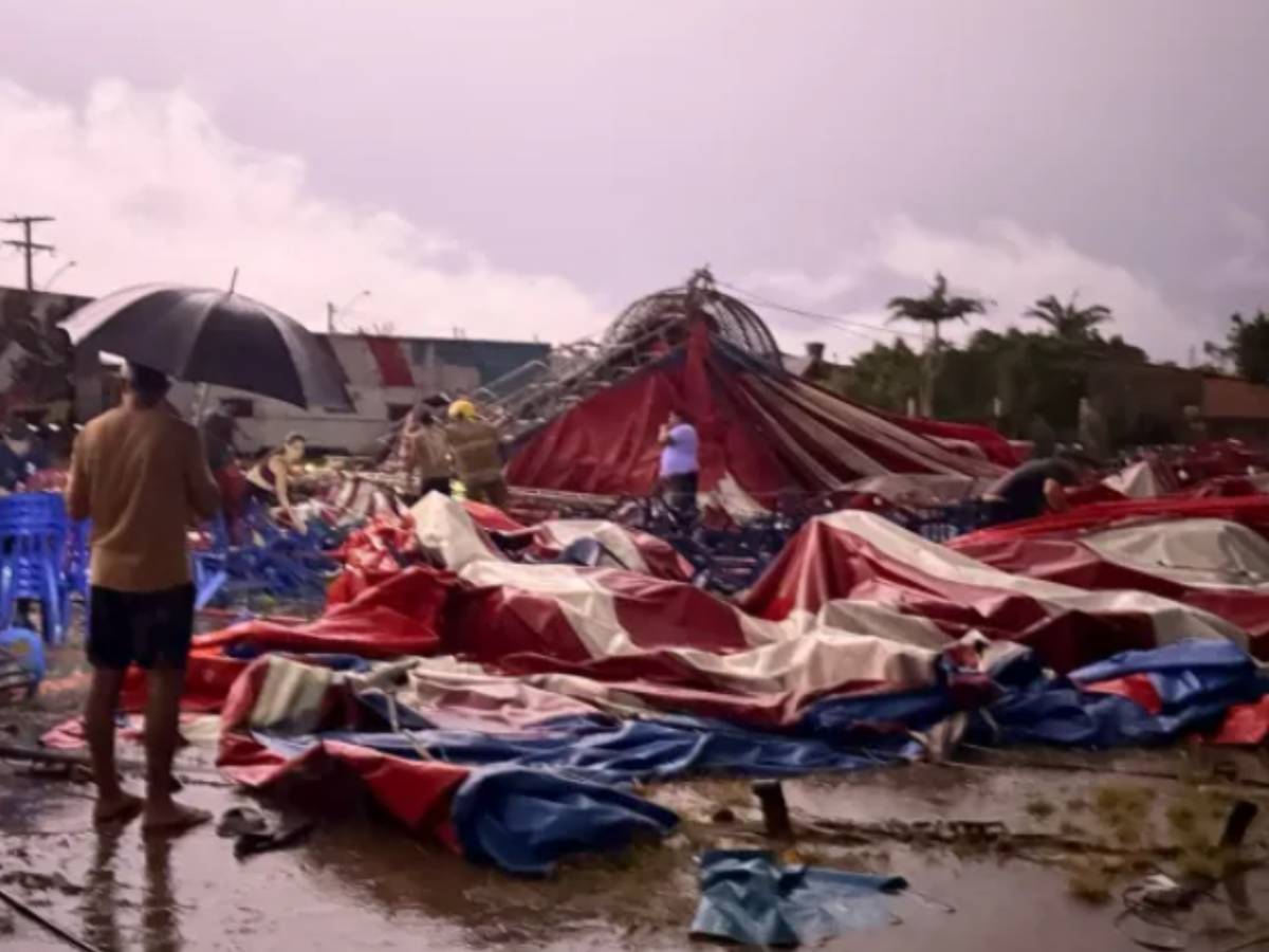 Parte da estrutura do Circo Fox desabou durante um forte temporal no Rio Grande do Sul, deixando 20 feridos; vítimas estavam na plateia