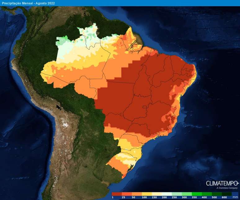 De forma geral, agosto será um mês muito seco, com volumes de chuva abaixo dos 25 mm em toda a região em vermelho mais escuro, e é bastante comum, áreas do centro e interior do país terminarem o mês sem nenhuma chuva.