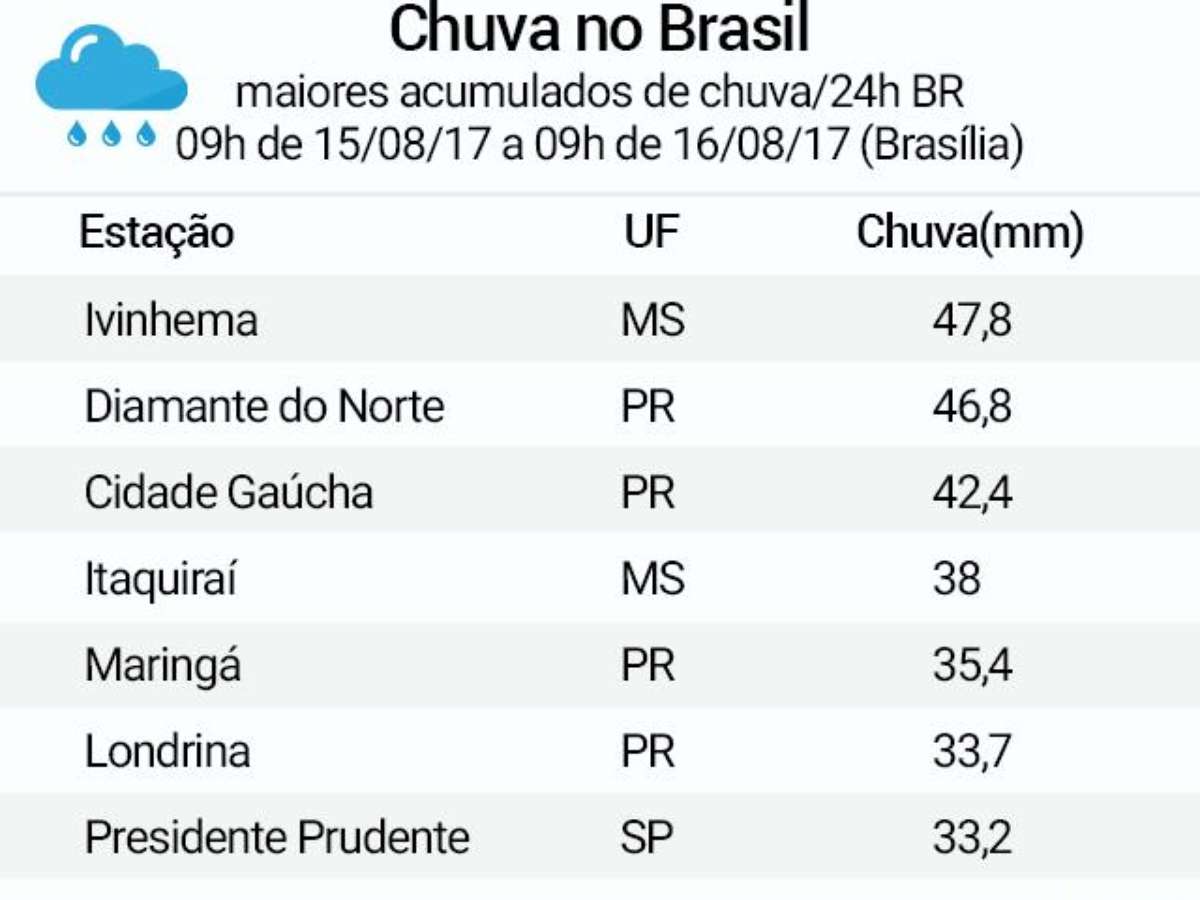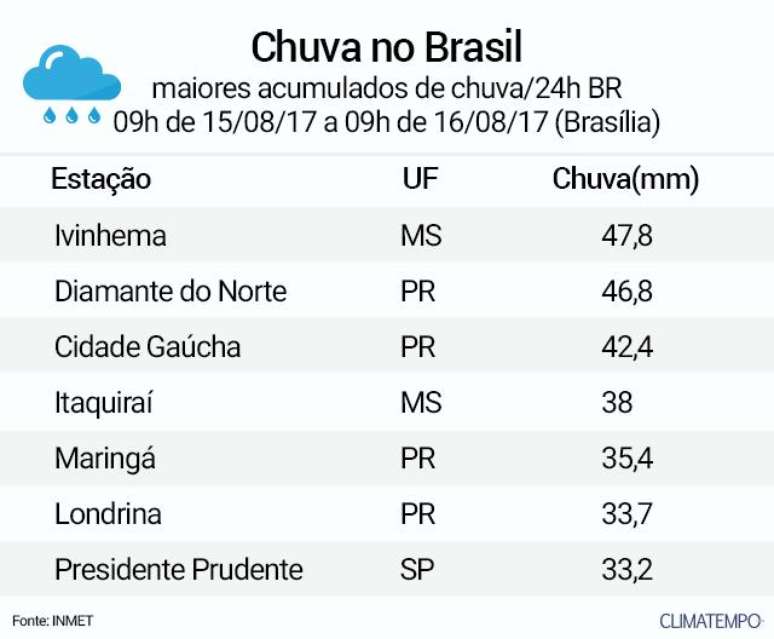Desde terça-feira (15), muitos volumes de chuva estão sendo registrados. A tabela abaixo mostra os maiores volumes de chuva registrados no Brasil entre 9 horas da manhã do dia 15/08 até 9 horas desta quarta-feira, dia 16, segundo o Inmet. Repare que MS, SP, PR é que registram os maiores volumes, dentro deste período de 24 horas. Observe: