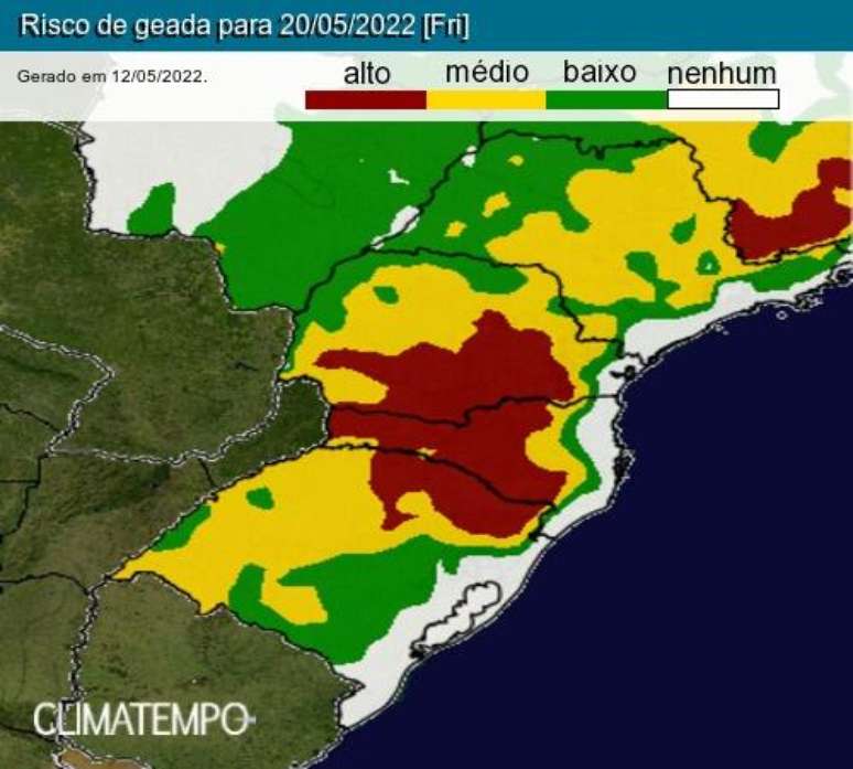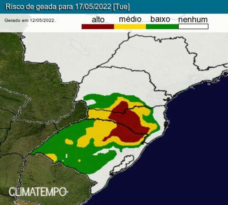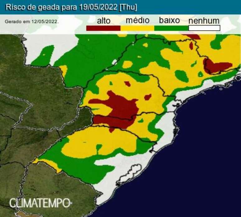 Com temperaturas previstas mais baixas, a chance de geadas aumenta em áreas produtoras do Paraná, além de baixadas, áreas de borda, em pés de café mais novos e áreas cuja a face esteja voltada para o quadrante sul na Mogiana, sul de Minas Gerais e Cerrado de Minas Gerais.
