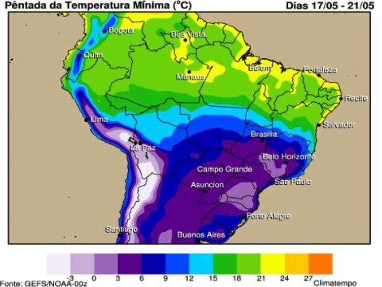 Foto: pêntada da temperatura mínima - áreas em roxo na legenda mostram temperaturas muito baixas