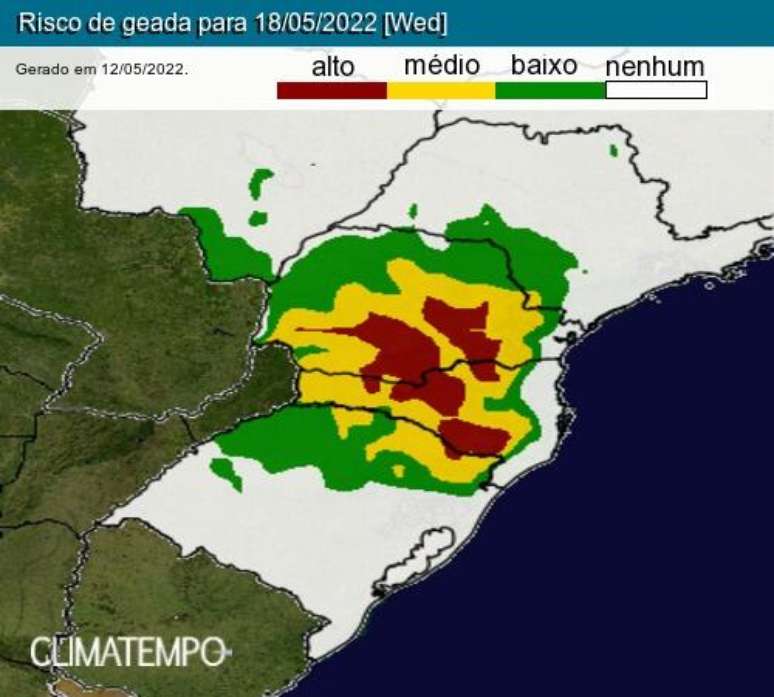 No Estado de São Paulo, estimam-se 2°C em Pedregulho e Franca, 3°C em Garça e 4°C em Caconde na quarta-feira (18/05). No Paraná, a temperatura alcança 4°C em Carlópolis, 2°C em Pinhalão e 0°C em Ibaiti no dia 18/05.