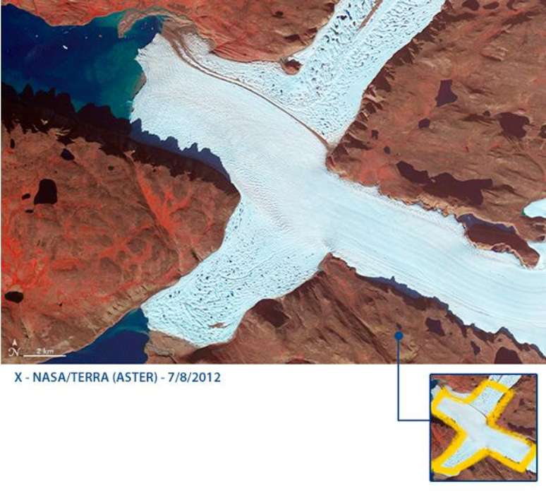 Letra X: porção noroeste da geleira Leidy, na Groenlândia.