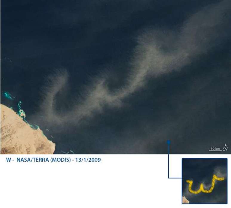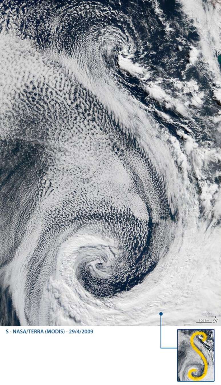 Letra S: nuvens rodopiando sobre o Atlântico Sul
