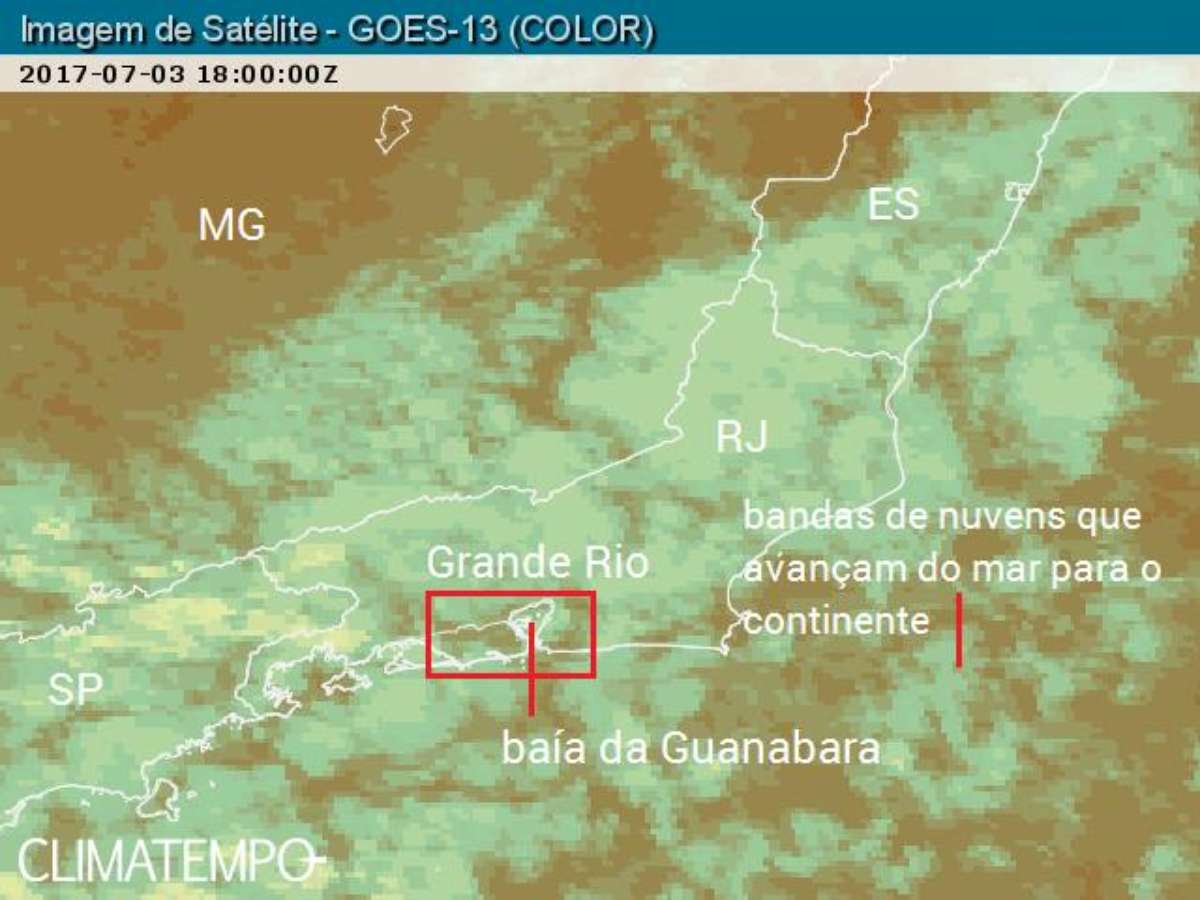 Na imagem de satélite das 15 horas de 3 de julho de 2017 (18:00 Z ou UTC) essas bandas de nuvens baixas aparecem como manchas esverdeadas sobre o mar e sobre o estado do Rio de Janeiro, avançando também para Minas Gerais, sobre o Espírito Santo e pelo leste de São Paulo.