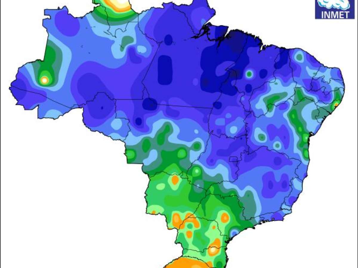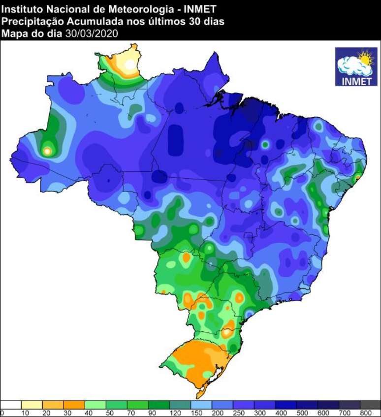 O mapa elaborado pelo INMET - Instituto Nacional de Meteorologia - revela quanto choveu sobre o Brasil no período de 1 a 30 de março de 2020.