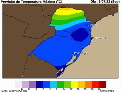 Previsão de temperatura máxima até quinta-feira, 21 de julho