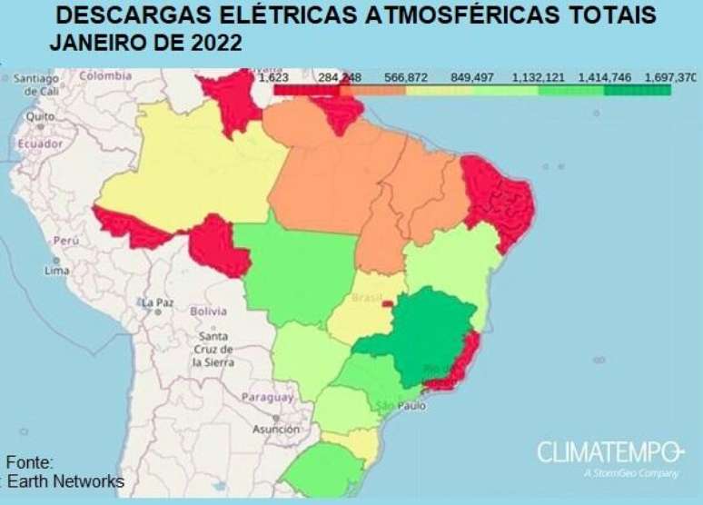 No total, o Brasil teve 13.212.202 milhões de descargas elétricas atmosféricas em janeiro de 2022, sendo que 3.619.988 milhões destas descargas foram raios. Os demais 9.592.214 milhões de descargas elétricas atmosféricas ocorreram entre as nuvens.