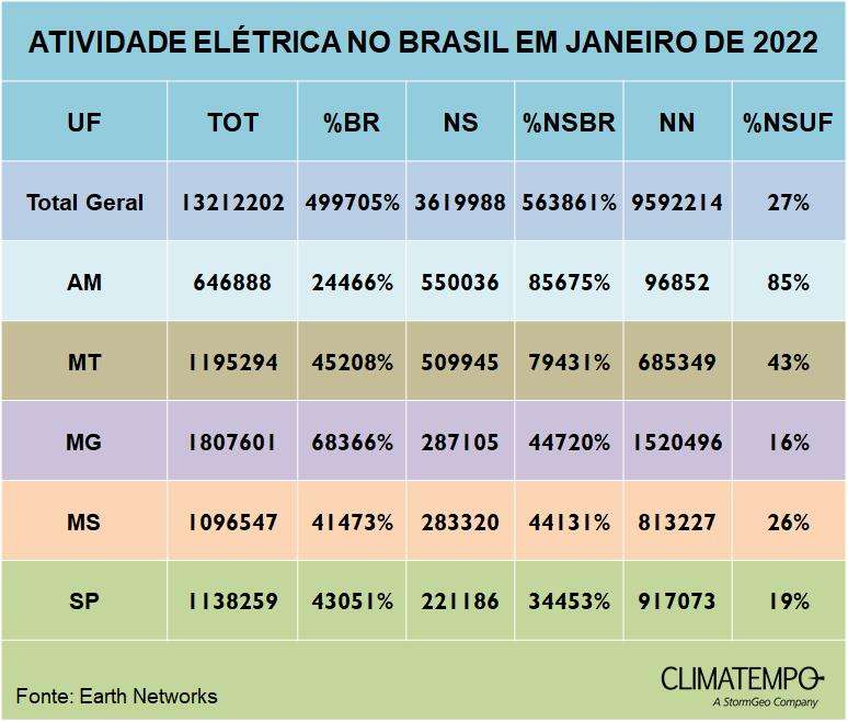 A medição por estado mostrou que a maior atividade elétrica geral em janeiro de 2022 ocorreu sobre Minas Gerais, mas a maior quantidade de raios foi sobre o Amazonas. Sozinho, o Amazonas ficou com 85% dos raios do país em janeiro de 2022, Mato Grosso teve 43% dos raios e Minas Gerais, 16%. Mato Grosso do Sul teve 26% dos raios do Brasil em janeiro de 2022 e São Paulo teve 16%.