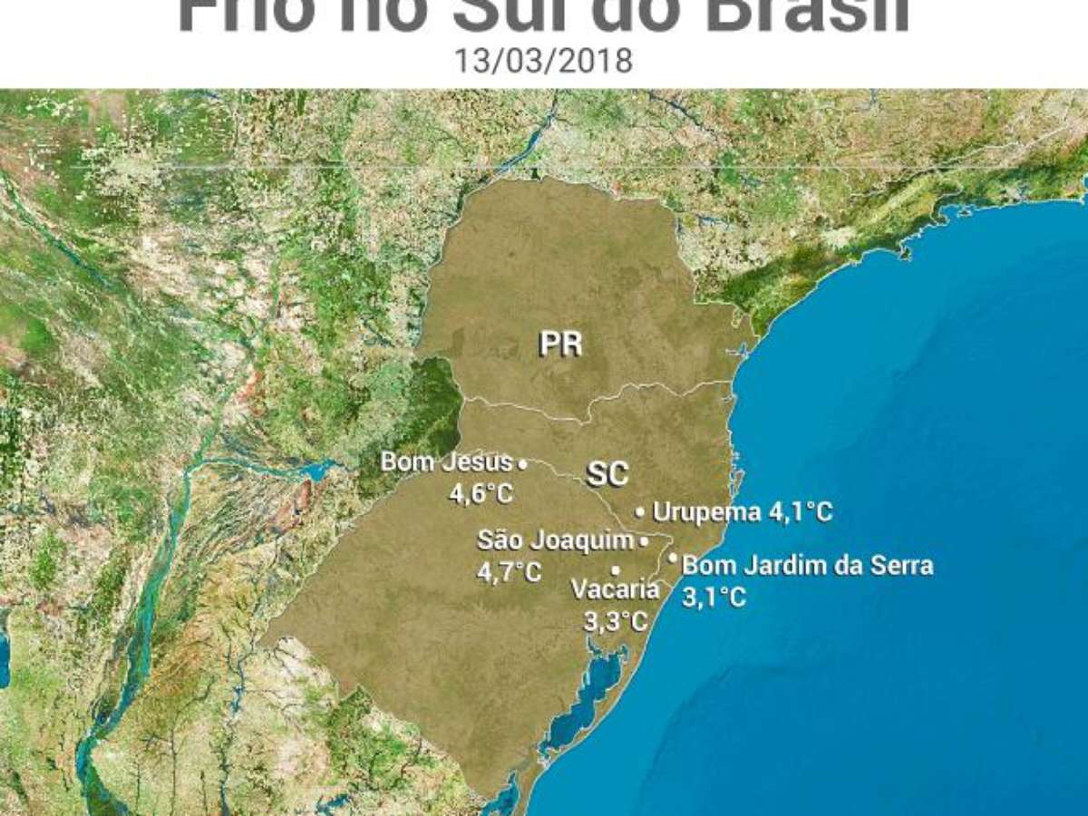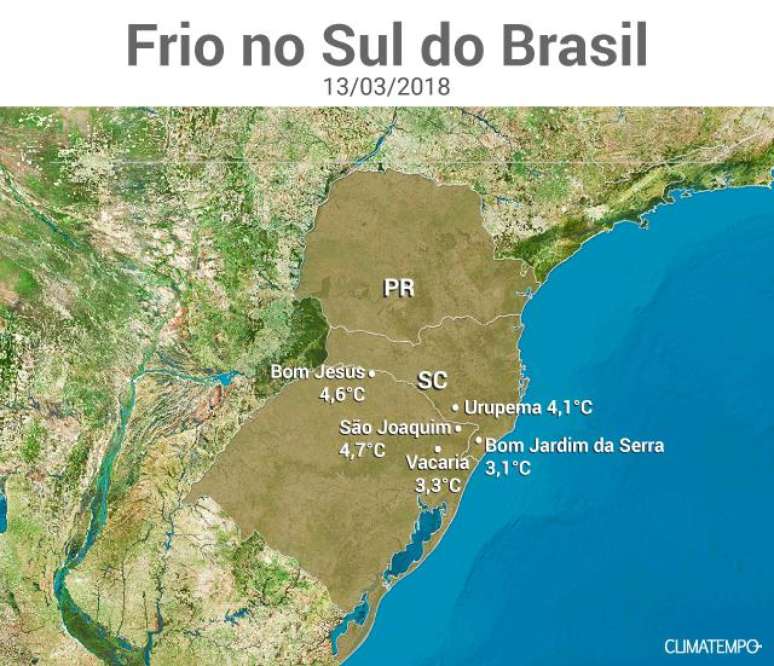 De acordo com dados do Epagri-Ciram, em Bom Jardim da Serra (SC) a temperatura registrada foi de 3,1°C. Foi a menor temperatura do país nesta terça-feira (13). Em Vacaria, na serra gaúcha a temperatura chegou a 3,3°C. "São temperaturas atípicas e mais baixas que o normal para esta época do ano", comenta a meteorologista Josélia Pegorim.