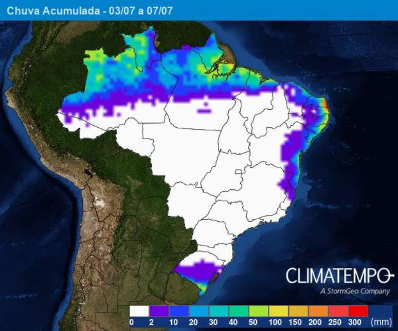 Enquanto grande parte do país continua sob influência do ar seco, a chuva segue concentrada em áreas do Norte, estados como Amazonas, Roraima, oeste e norte do Pará e Amapá, com pancadas de chuva forte nos próximos dias.