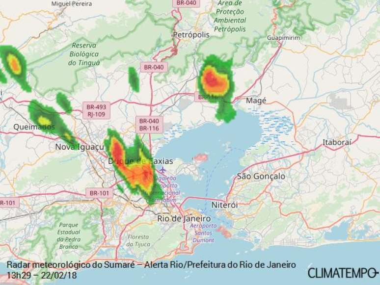 Por volta das 13h30, o radar meteorológico do Sumaré operado pelo Alerta Rio - Prefeitura do Rio se Janeiro detectava chuva moderada a forte Nova Iguaçu e Duque de Caxias, avançando para a zona norte da cidade do Rio de Janeiro. O Alerta Rio registrou 2,4 mm em 10 min no Irajá, entre 13h25 e 13h35
