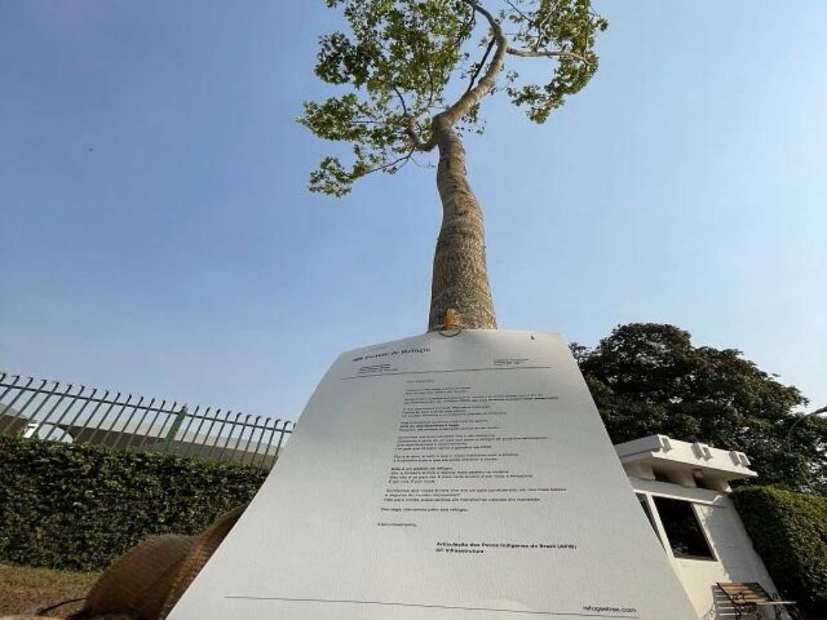 A árvore foi levada à entrada da embaixada, onde Sonia Guajajara, coordenadora executiva da Apib, leu uma carta com um pedido de socorro. O apelo foi aceito e o jatobá foi transportado para dentro do espaço da representação norueguesa. Trata-se de um acolhimento simbólico para representar a luta de ambientalistas pela preservação da nossa floresta.