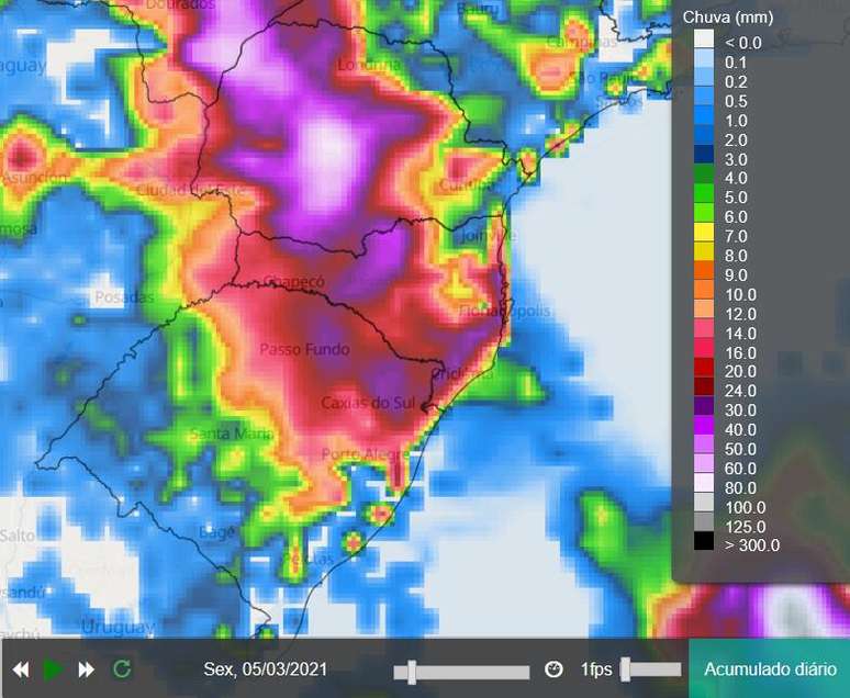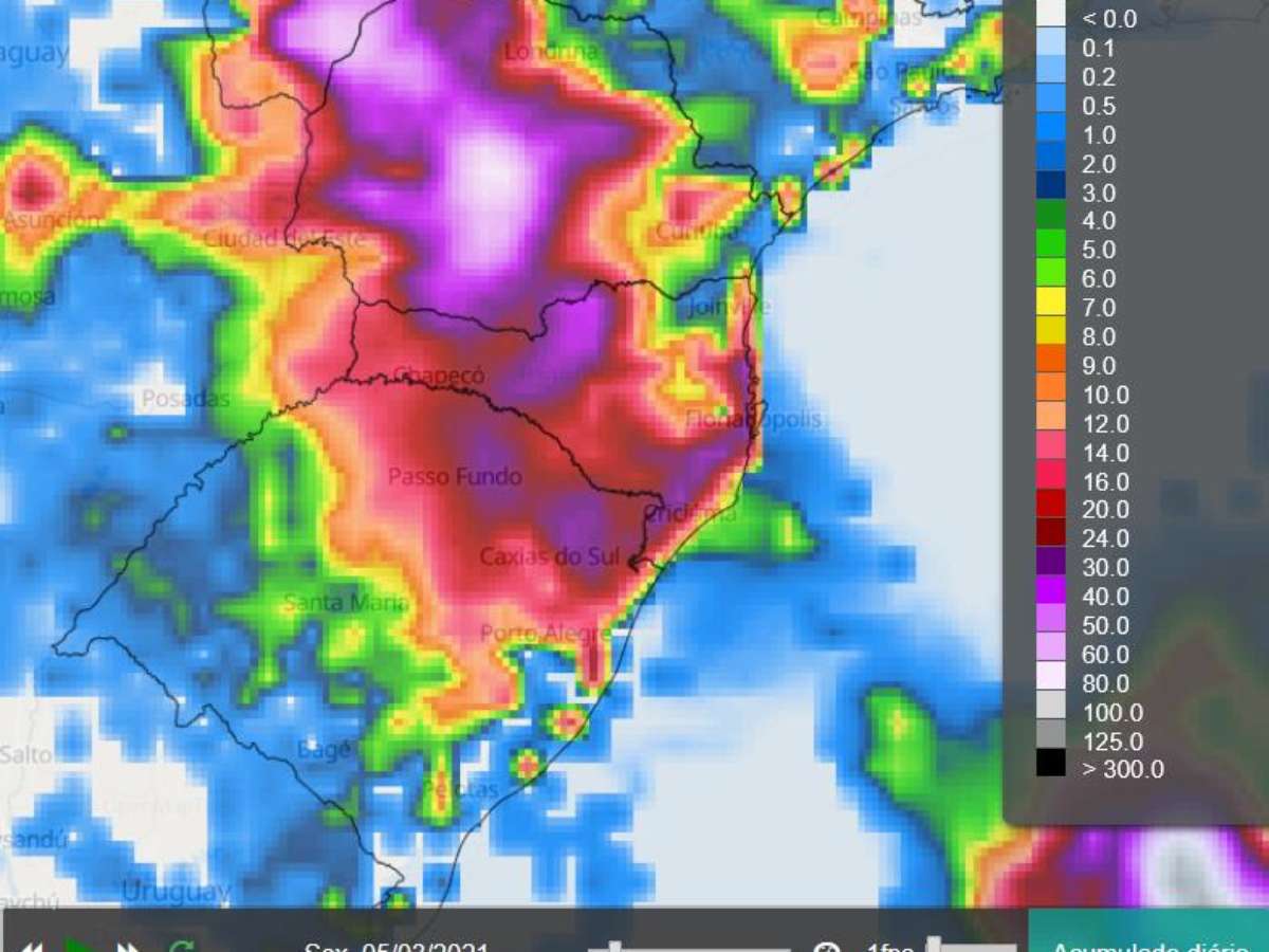 A formação de uma área de baixa pressão próximo ao litoral gaúcho e catarinense reforça as instabilidades que já estão sobre a região provocando chuva volumosa nos dois estados. O mapa abaixo indica a previsão de chuva acumulada. Veja os detalhes: