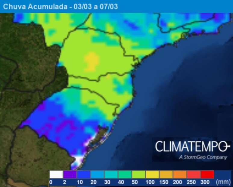 Entre os dias 3 e 7 de março, a previsão é de tempo úmido em todo o Paraná, em Santa Catarina e no norte do Rio Grande do Sul. Veja o mapa: